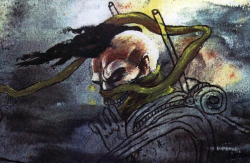 Silent shadows crawled across his cowled features, not concealing but revealing his true nature. In that face, nothing was fixed, all was fluid in a primeval ocean of creation. Behind the torn veil of flesh lurked a skeletal impression of decay. His eyes seemed an eternity away, sunk at the bottom of fathomless pits of darkness, drawing my gaze inwards into the emptiness of his soul.